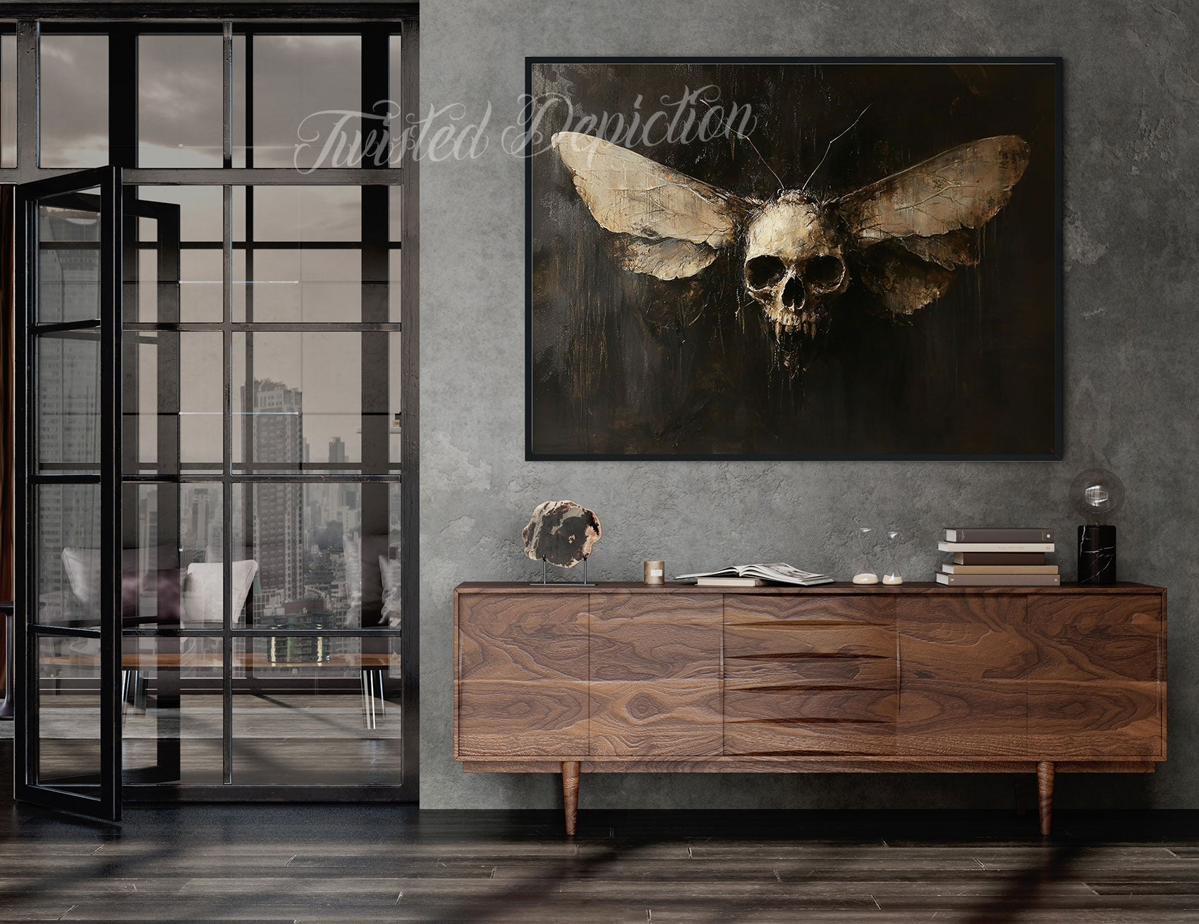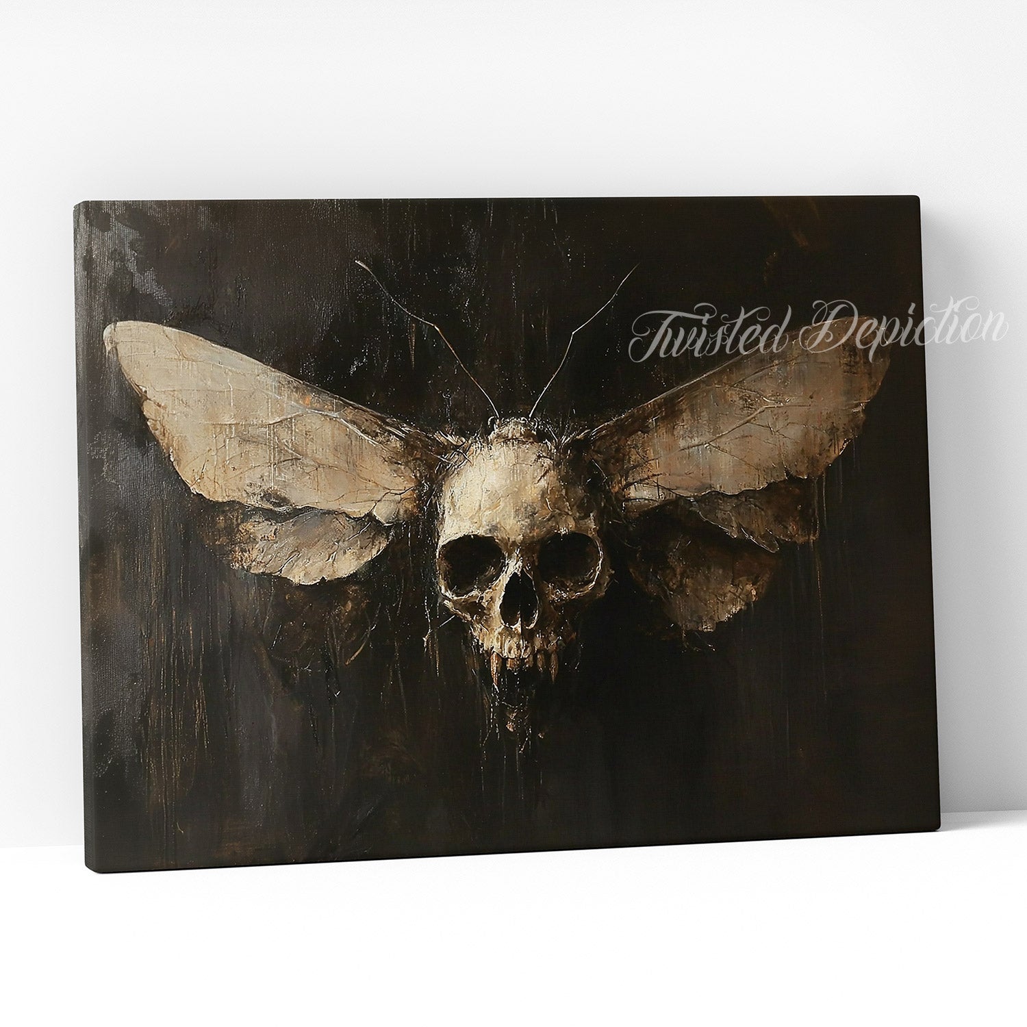 A haunting art piece where delicate wings meet macabre symbolism. This dark painting features a moth with a skull-formed body, merging nature's fragility with mortality's grip. Perfect for those drawn to gothic aesthetics and the darker corners of art. A striking statement piece that transforms any space into a gallery of the beautifully sinister.
