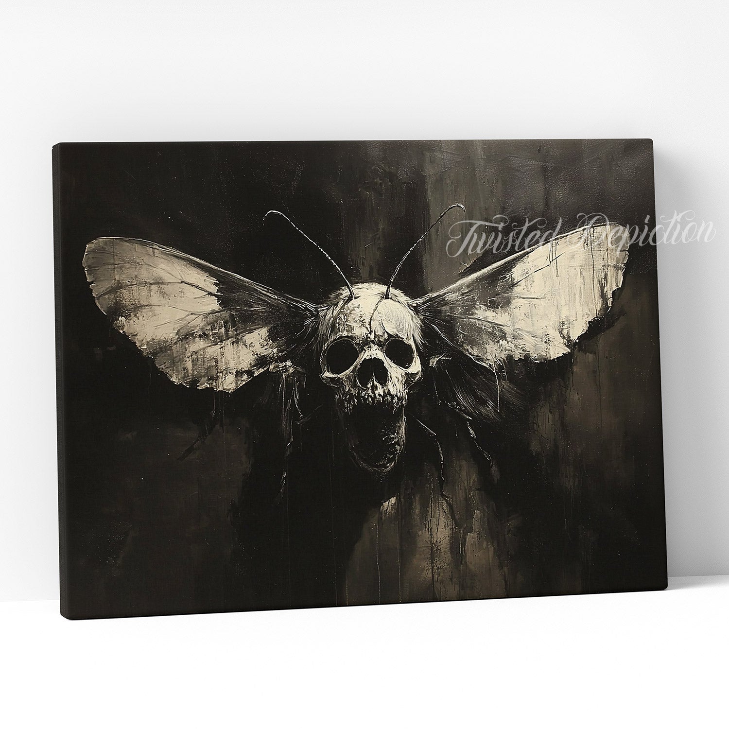 Witness the collision of ethereal beauty and skeletal dread in this chilling artwork. A moth bearing a skull as its body emerges from shadow, embodying the eternal dance between life and death. Ideal for collectors of gothic imagery and those who appreciate art that dwells in darkness. This commanding piece infuses any room with an atmosphere of elegant terror and haunting intrigue.