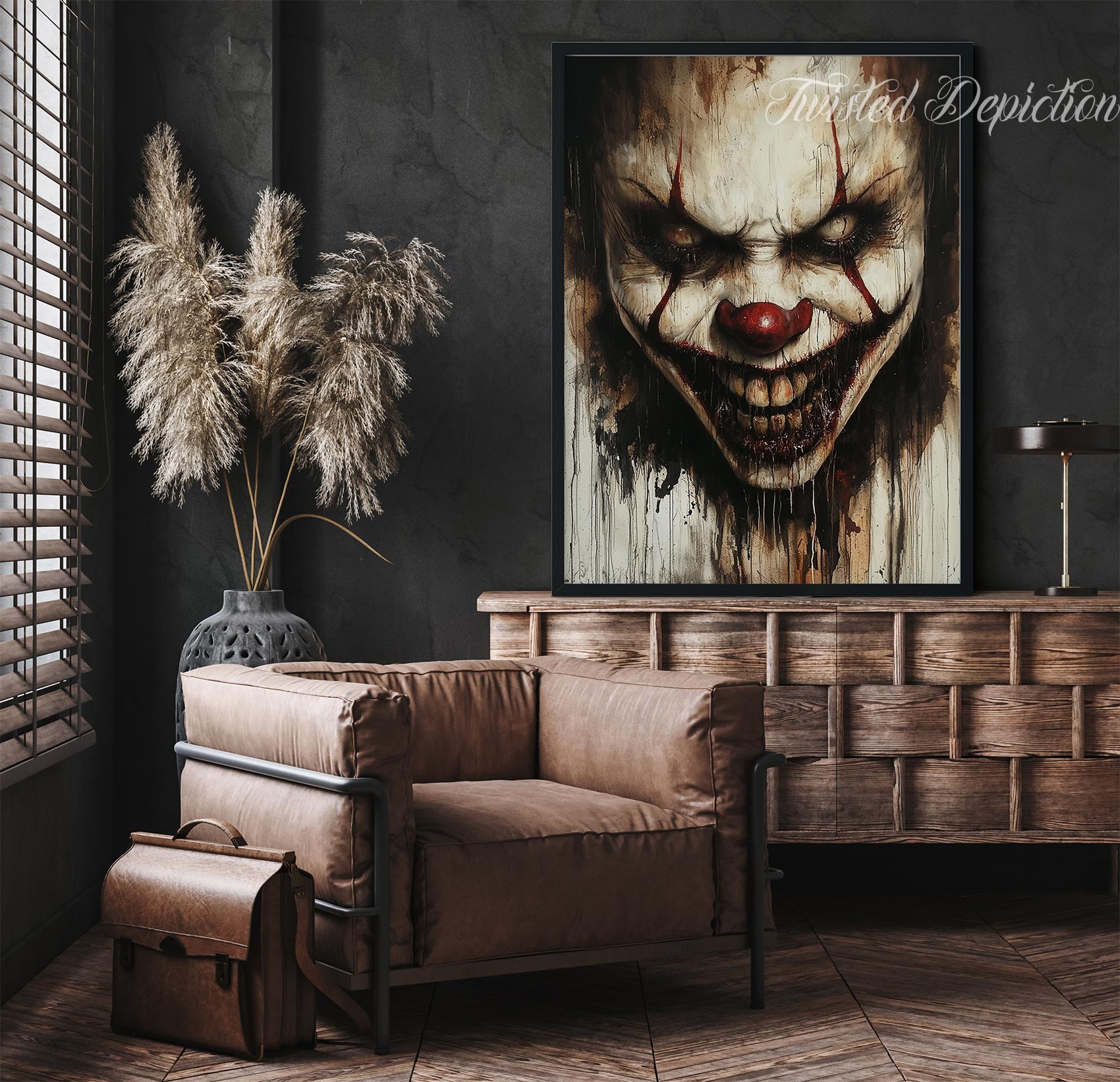 Sightless Evil features a haunting horror clown with lifeless blind eyes and a sinister, evil grin. This morbid painting captures a disturbing presence that chills the soul, perfect for those who appreciate dark and twisted artistry that lingers long after the gaze is averted.