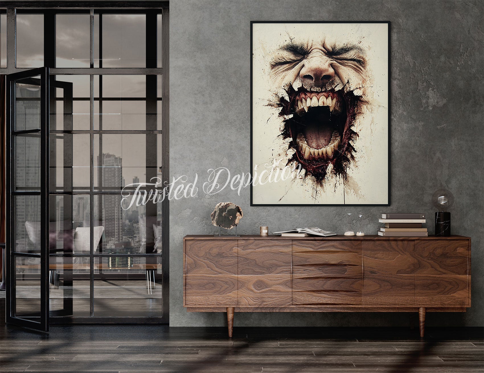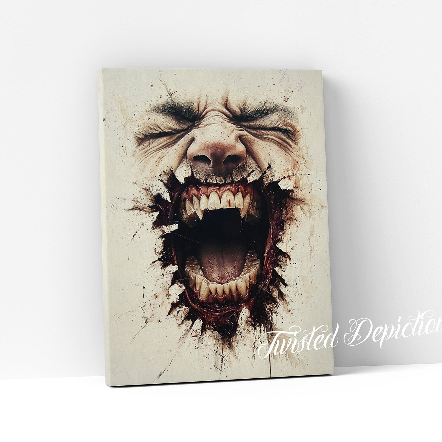 Cracks of Flesh - SCREAM depicts a tormented face bursting through a cracked wall, silent agony replaced by a primal scream. This morbid painting channels raw emotion and torment, making it a haunting centerpiece for those drawn to intense, dark art.