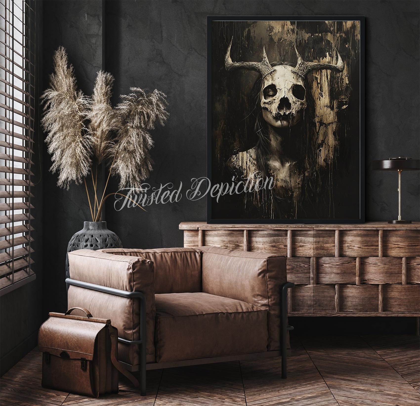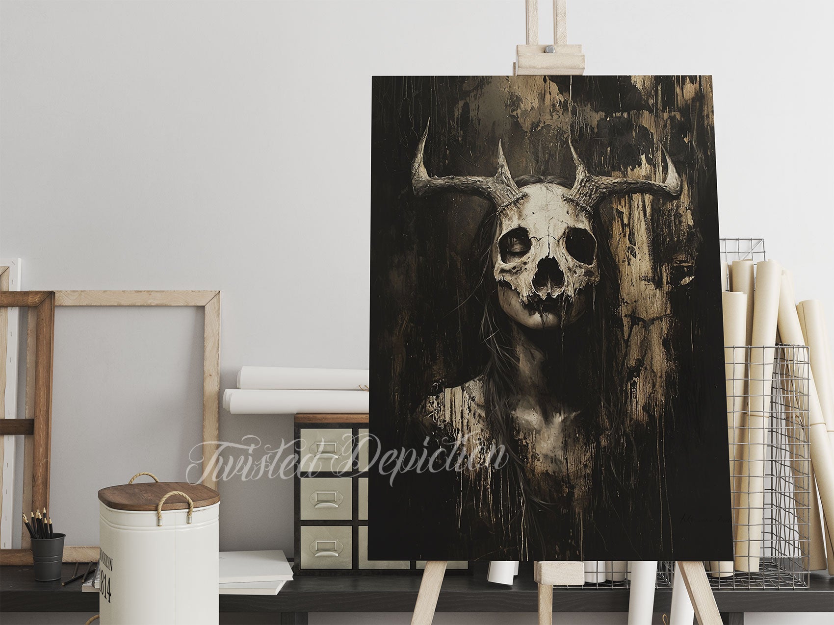 Norse Völva is a one-of-a-kind original painting depicting a Norse seeress fused with a deer skull, drawing from pre-Christian Norse mythology and seiðr ritual magic. The völva, a feared and revered seeress, stands between worlds, with bone and human form merging to symbolize prophecy, death, and the wild forces of nature. This one-off art piece is created for collectors of dark surreal art, Norse mythology art, and Viking pagan symbolism