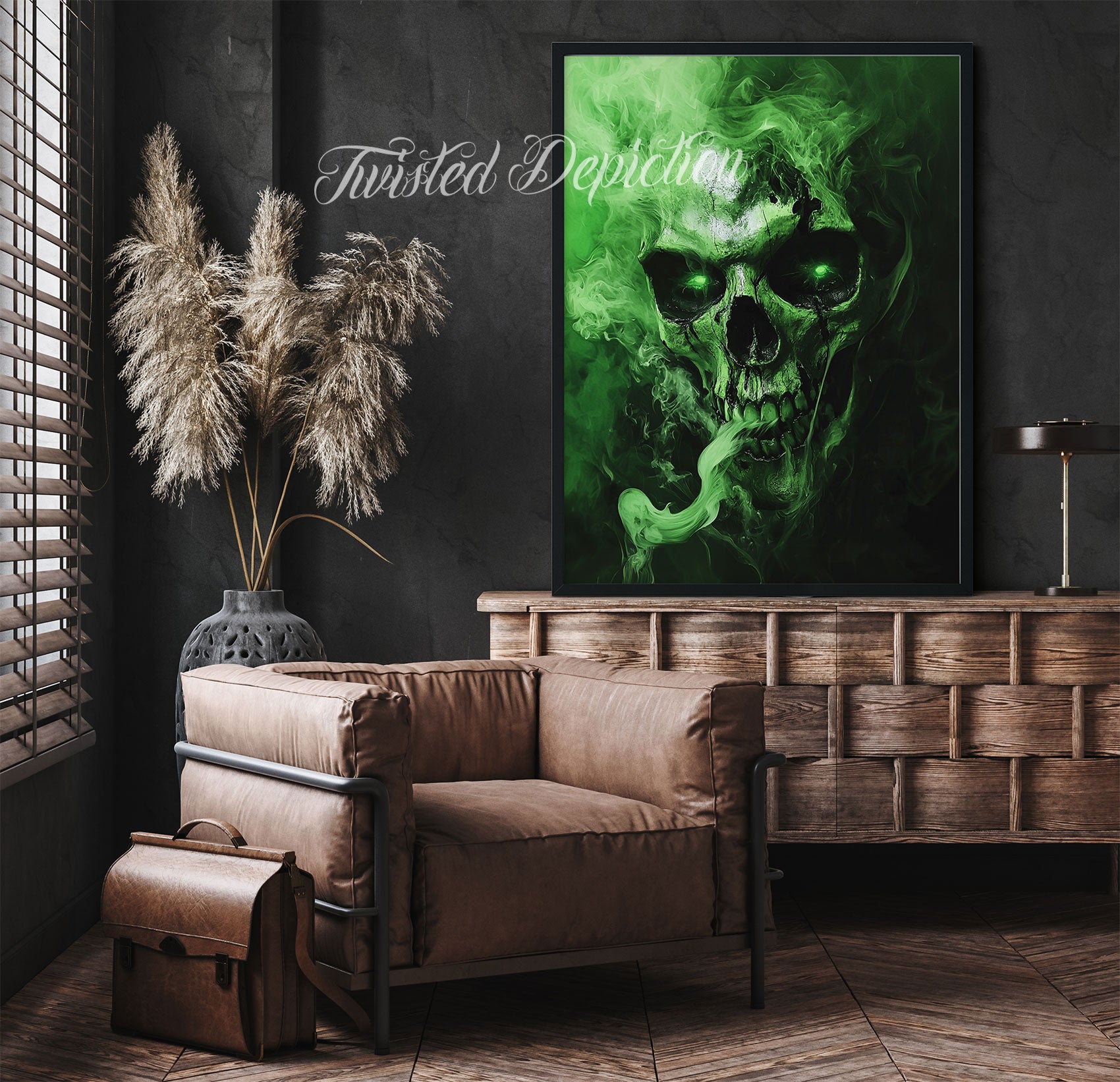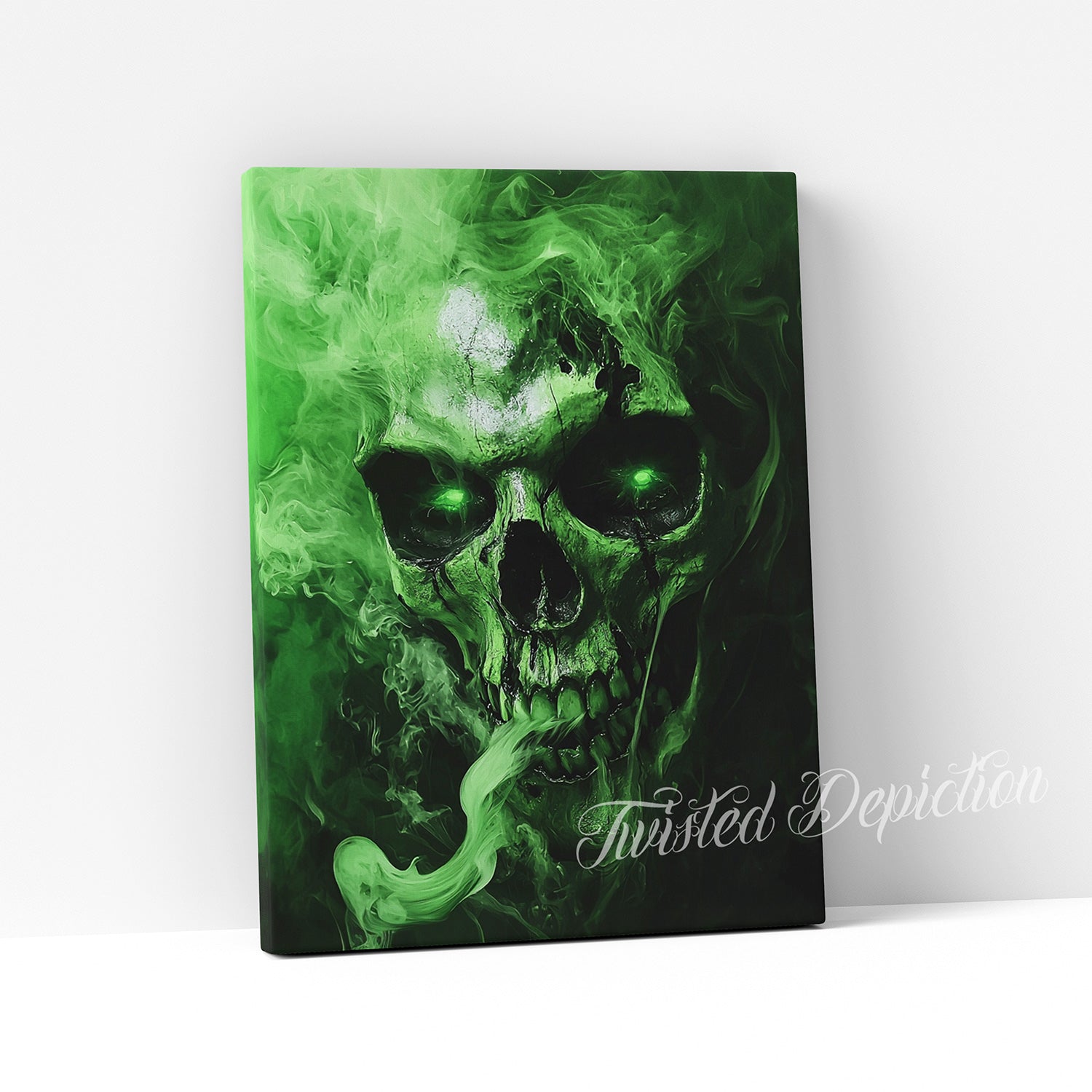 A striking painting of a toxic green skull with glowing eyes that pierce through the canvas. Swirling smoke effects enhance the supernatural atmosphere, merging dark imagery with vibrant color. Perfect for collectors who appreciate bold, unconventional art. A commanding statement piece for alternative spaces.